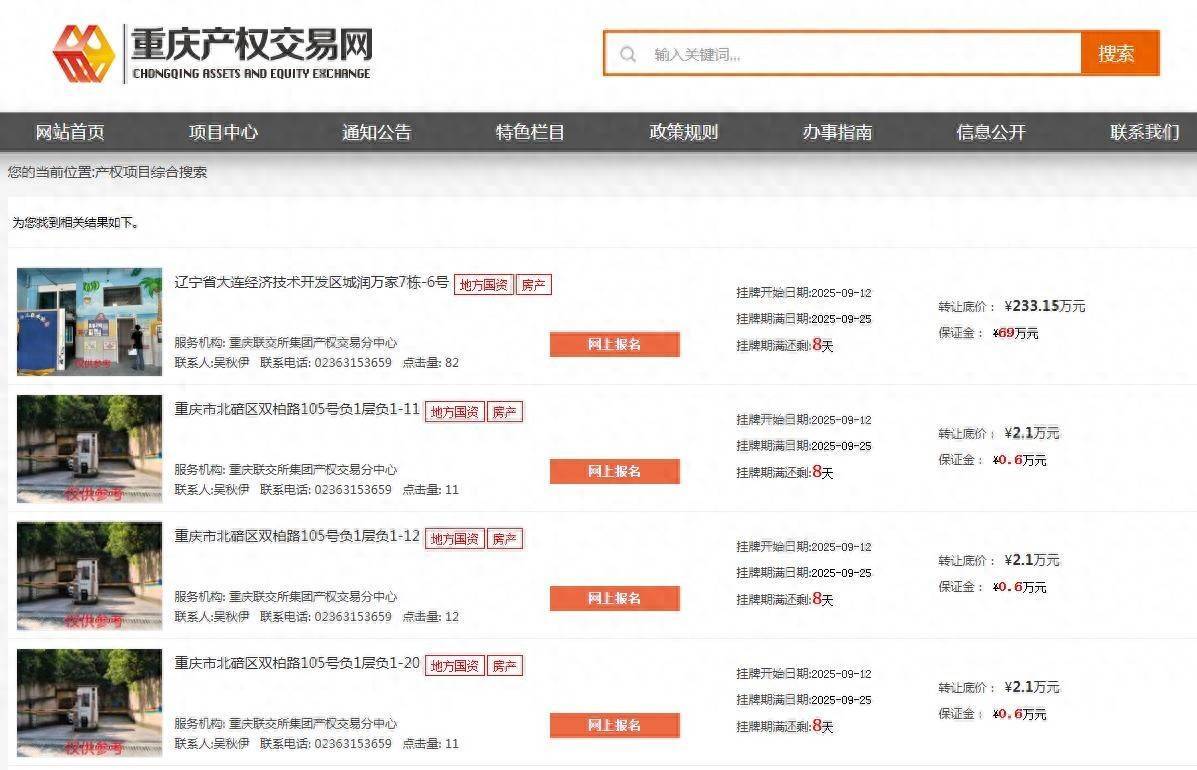 截图来源:重庆产权交易网重庆产权交易网信息显示,西南证券这一批资产转让项目中,包括68个重庆“正源橡园”小区车位,单价底价统一2.1万元/个,仅限本小区业主凭产权证购买,一证限购一个车位;安徽亳州外经钻石广场122.66平米房产(转让底价104.26万元)、辽宁大连“城润万家”666.15平米房产(转让底价233.15万元),以及3辆奥迪小轿车(京/沪/深号牌,底价约2.36万-2.65万元)。其中,车辆挂牌期为9月10-17日,其余车位与房产为9月12-25日。
