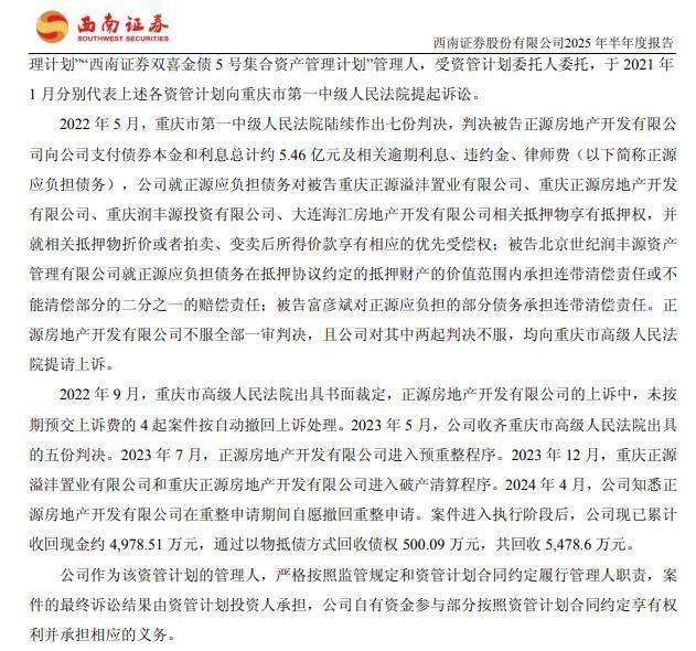 其一是正源地产债务链。2019年,正源地产爆发债务危机,公司债违约,西南证券6只资管产品因此“踩雷”。2021年,西南证券代表资管计划起诉;2022年一审胜诉,法院判令正源地产向西南证券偿付本息合计约5.46亿元并承担逾期利息/违约金,同时确认西南证券对重庆润丰源、大连海汇等4家公司抵押物享有抵押权并优先受偿;2023年重庆高院对部分案件维持原判。